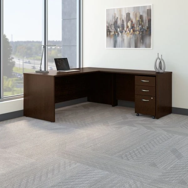 Bush Business Furniture Series C 72W L Shaped Desk with 48W Return and Mobile File Cabinet in Mocha Cherry – Functionality meets style with this Bush Business Furniture Series C L Shaped Desk. Make a professional statement with the clean lines, Brushed Nickel hardware and extended modesty panels of Series C. Depend on the durable thermally fused laminate finish, sturdy construction and rugged edge banding for long-lasting commercial quality. Spread out with your computer, phone, paperwork and more on the roomy 72W and 48W work surfaces, and feed your cables through wire management grommets to keep them under control. Take care of your filing and storage needs with the convenient Mobile File Cabinet, which fits underneath the Desk or rolls anywhere. The options are endless with Series C. This affordable office furniture boasts quality craftsmanship to withstand the rigors of a 40-plus hour work week. Seven stylish finishes blend seamlessly in any environment. Multiple layout options meet the needs of numerous workspaces, from the private or home office to reception areas and conference rooms. Series C evolves with your preferences, allowing you to reconfigure your workspace as required with a complete line of coordinated commercial office furniture. American made with U.S. and imported parts.
