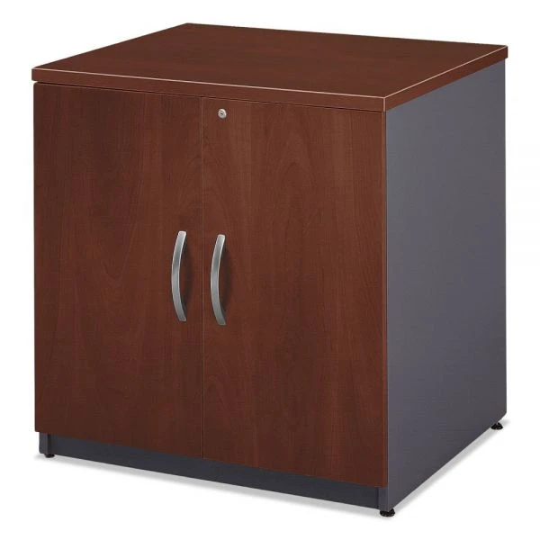 Bush Business Furniture Series C: Hansen Cherry 30W Storage Cabinet – Customize your storage with the Bush Business Furniture Series C Collection 30W Storage Cabinet finished in Hansen Cherry for classic styling with clean lines. This convenient storage unit offers Euro-style self-closing hinges and a lock to secure your supplies. The interior offers ample space with an adjustable shelf to make room for electronics, printers and more. This unit is constructed with 100% thermally fused laminate for durability and superior resistance to scratches and stains. Integrated wire management grommet located in the back of the cabinet keeps your office neat, while adjustable leveling glides enable you to compensate for uneven floors. Combine the 30W Storage Cabinet with a 30W Hutch to expand your storage capacity, while creating an attractive wall unit. Place the Hutch at the end of your Series C desk to increase desk storage and function. Two Storage Cabinets work side-by-side and can accommodate a 60W Hutch for greater versatility. Solid construction meets ANSI/BIFMA test standards in place at time of manufacture. The Series C Collection is backed by the Bush Business Furniture 10-Year Warranty. American made with U.S. and imported parts.
