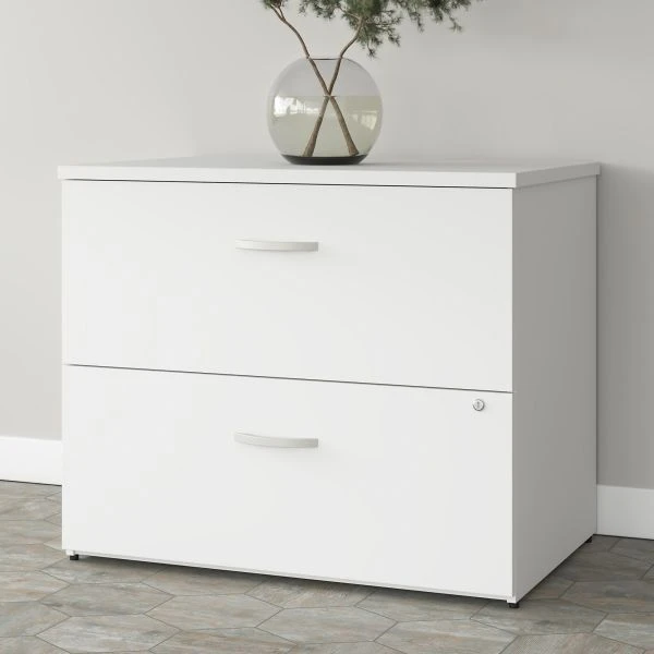 Bush Business Furniture Studio A 2 Drawer Lateral File Cabinet in White – Assembled – The Bush Business Furniture Studio A 2 Drawer Lateral File Cabinet combines a fresh, contemporary appearance with the commercial quality construction needed to withstand years of everyday use. Keep all your letter, legal and A4-size documents organized inside two drawers that open on full-extension ball bearing slides for an effortless reach to contents. A single lock secures both drawers to protect files with sensitive information and safeguard any personal items you don’t want left out in the open. Each drawer can hold up to 88 pounds of materials. The lateral filing cabinet’s stable design and included wall attachment hardware make it a safe choice for use in virtually any home or professional office environment. Find the right look for your space with three contemporary finish options: White, Storm Gray and Platinum Gray. This 2 Drawer File Cabinet has been meticulously tested to meet or exceed ANSI/BIFMA quality standards for safety, durability and performance and is backed by the Bush Business Furniture 10 Year Manufacturer’s Warranty. Upgrade your office as needed with a Studio A Computer Desk, Storage Cabinet and Bookcase (coordinating items sold separately). American made with U.S. and imported parts.