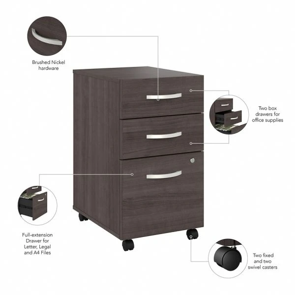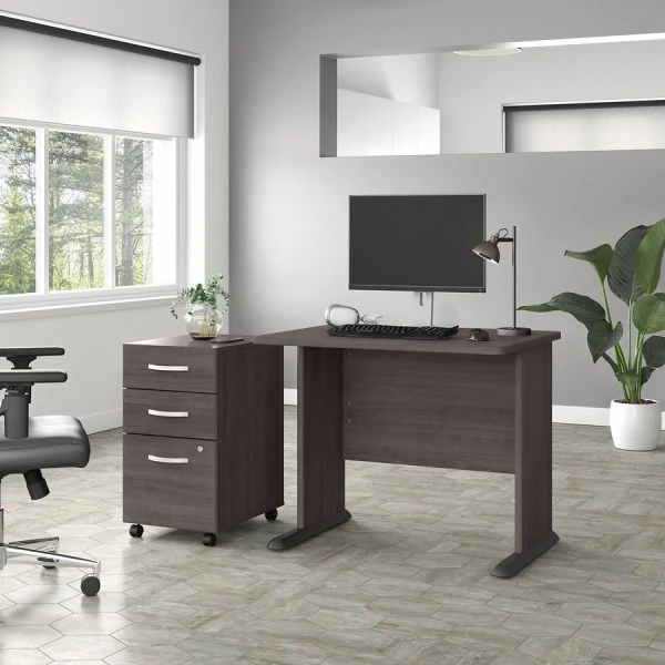 Bush Business Furniture Studio A 36W Small Computer Desk with 3 Drawer Mobile File Cabinet in Storm Gray – The Bush Business Furniture Studio A 36W Computer Desk with 3 Drawer Mobile File Cabinet combines a fresh, contemporary appearance with the commercial quality construction needed to withstand years of everyday use. A compact surface makes this small desk with drawers a perfect choice for areas where space is limited. Set up with a computer and equipment on a durable thermally fused laminate desktop that supports up to 200 pounds. A built-in wire management grommet keeps cords and cables in order so the surface remains free from unnecessary clutter. The base of the office desk features adjustable levelers to compensate for uneven floors, and wall attachment hardware is included along with the stable design for maximum safety and security. The filing cabinet’s bottom drawer accepts letter, legal and A4-size paperwork while a pair of box drawers organize supplies. The two bottom drawers can be locked to protect sensitive files and personal items. Find the right look for your space with three contemporary finish options: White, Storm Gray and Platinum Gray. This compact desk set has been meticulously tested to meet or exceed ANSI/BIFMA quality standards for safety, durability and performance and is backed by the Bush Business Furniture 10 Year Manufacturer’s Warranty. Upgrade your office as needed with a Studio A Storage Cabinet, Lateral File Cabinet and Bookcase (coordinating items sold separately). American made with U.S. and imported parts.