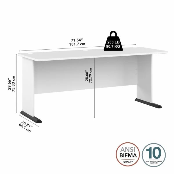 Bush Business Furniture Studio A 72W Computer Desk in White – The Bush Business Furniture Studio A 72W Computer Desk combines a fresh, contemporary appearance with the commercial quality construction needed to withstand years of everyday use. An expansive work surface makes this large desk a perfect choice for professionals and gamers who need plenty of room to spread out. Set up with a computer and all your equipment on a durable thermally fused laminate desktop that supports up to 200 pounds. Three built-in wire management grommets keep cords and cables in order so the surface remains free from unnecessary clutter. The base features adjustable levelers to compensate for uneven floors, and wall attachment hardware is included along with the stable design for maximum safety and security in any home or professional office. The PC/gaming desk is finished on all sides to look great facing any direction. Find the right look for your space with three contemporary finish options: White, Storm Gray and Platinum Gray. This long desk has been meticulously tested to meet or exceed ANSI/BIFMA quality standards for safety, durability and performance and is backed by the Bush Business Furniture 10 Year Manufacturer’s Warranty. Upgrade your office as needed with a Studio A Storage Cabinet, File Cabinet and Bookcase (coordinating items sold separately). American made with U.S. and imported parts.