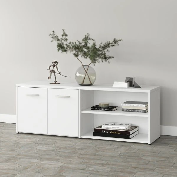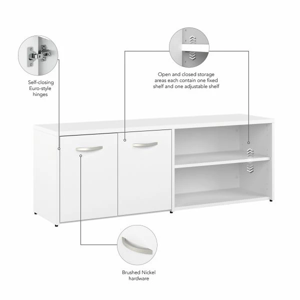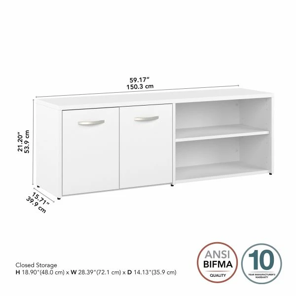 Bush Business Furniture Studio A Low Storage Cabinet with Doors and Shelves in White – The Bush Business Furniture Studio A Low Storage Cabinet with Doors and Shelves combines a fresh, contemporary appearance with the commercial quality construction needed to withstand years of everyday use. Its open and closed compartments each include one fixed shelf and one adjustable shelf to accommodate everything from books and reference materials to decorations. Each shelf supports up to 50 pounds, so storing and displaying larger items is never an issue. The surface of the storage credenza can be used as a practical place to keep a small printer and other equipment or to give your workspace a personal touch with plants, pictures and more. Find the right look for your space with three contemporary finish options: White, Storm Gray and Platinum Gray. This office credenza storage cabinet with shelves has been meticulously tested to meet or exceed ANSI/BIFMA quality standards for safety, durability and performance and is backed by the Bush Business Furniture 10 Year Manufacturer’s Warranty. Upgrade your office as needed with a Studio A Computer Desk, File Cabinet and Bookcase (coordinating items sold separately). American made with U.S. and imported parts.
