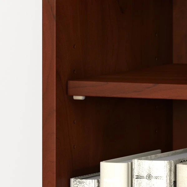 Bush Business Furniture Studio C 5 Shelf Bookcase in Hansen Cherry – The Bush Business Furniture Studio C 5 Shelf Bookcase looks great, works hard and adjusts to fit the needs of your office. Designed with 2 fixed and 3 adjustable shelves, the tall Bookcase holds your books and reference materials with room for your favorite decorative accents. Store a variety of items on the spacious and durable shelves, designed to hold up to 50 pounds each. A thermally fused laminate finish fends off scratches, stains and dents throughout years of everyday use. Add the coordinating Bookcase Door Kit (sold separately) to conceal the lower shelves for an organized look. The 5 Shelf Bookcase features a classic design but comes in your choice of several contemporary and traditional finishes to fit perfectly in any workspace. Purchase a set of Bookcases to build a complete storage wall that organizes your office and expresses your style. This 5 tier bookshelf is backed by a 10 Year Manufacturer’s Warranty and meets ANSI/BIFMA quality test standards. See the full collection for coordinating items available to make your office your own with Studio C. American made with U.S. and imported parts.