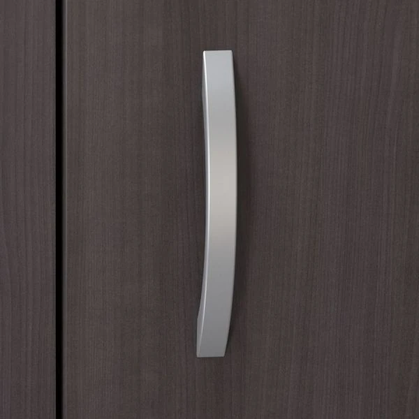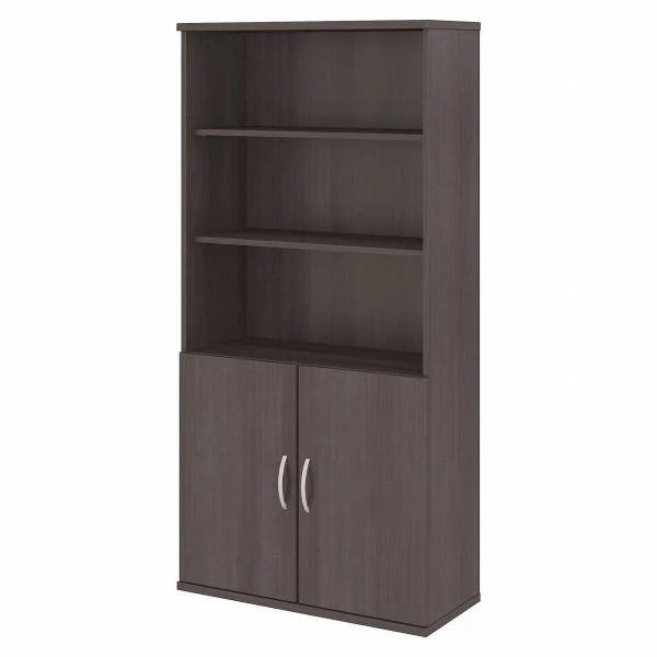 Bush Business Furniture Studio C 5 Shelf Bookcase with Doors in Storm Gray – The Bush Business Furniture Studio C 5 Shelf Bookcase with Doors looks great, works hard and adjusts to fit the needs of your office. Designed with 2 fixed and 3 adjustable shelves, the Bookcase holds your books and reference materials with room for your favorite decorative accents. Store a variety of items on the spacious and durable shelves, designed to hold up to 50 lbs each. A thermally fused laminate finish fends off scratches, stains and dents throughout years of everyday use. The doors conceal your office supplies and add an eye-catching touch to your workspace. With attractive Brushed Nickel hardware, doors cover the lower shelves and self-closing Euro-style hinges make for an easy open and shut. The 5 Shelf Bookcase features a classic design but comes in a contemporary White or Storm Gray finish to fit perfectly in modern workspaces. Purchase a set of Bookcases to build a complete storage wall that organizes your office and expresses your style. This contemporary 5 Shelf Bookcase comes with a 10 Year Warranty and meets ANSI/BIFMA quality test standards. See the full collection for coordinating items available to make your office your own with Studio C. American made with U.S. and imported parts.