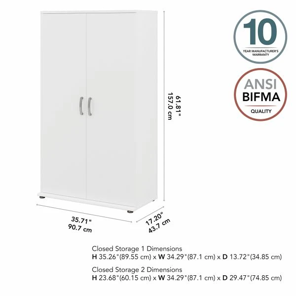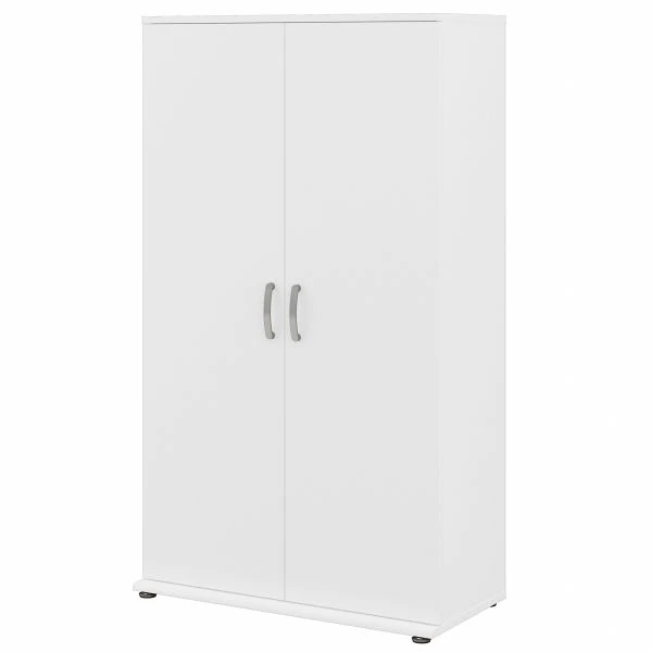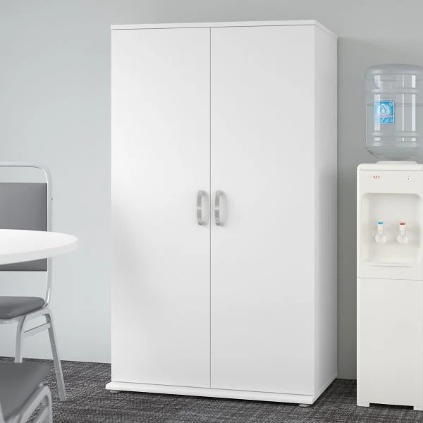 Bush Business Furniture Universal Tall Storage Cabinet with Doors and Shelves in White – The Bush Business Furniture Universal Tall Storage Cabinet with Doors and Shelves features a commercial quality design and contemporary styling that suits virtually any home or professional environment. Organize your office, breakroom, garage, laundry room or another work or living space with a tall accent cabinet that’s built to last and boasts plenty of practical storage capacity. Cabinet doors with smooth Euro-style hinges open to reveal two fixed shelves and three adjustable shelves that accommodate office supplies, books, tools and household items of various sizes. Each shelf supports up to 50 pounds, so storing larger materials is no problem. The Floor Cabinet’s base has adjustable levelers to compensate for uneven surfaces, and wall attachment hardware is included for maximum stability. Contemporary finish options include Storm Gray, Platinum Gray and White with Brushed Nickel hardware. This Tall Cabinet has been tested to meet ANSI/BIFMA quality standards for safety and performance and is backed by the Bush Business Furniture 10 Year Manufacturer’s Warranty. Create your own modular storage solution by adding the Universal Floor Storage Cabinet with Doors and Shelves, Floor Storage Cabinet with Drawer and Shelves, Floor Storage Cabinet with Drawers, Wall Cabinet with Doors and Tall Narrow Storage Cabinet (coordinating items sold separately).