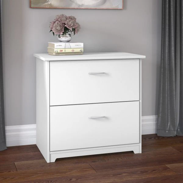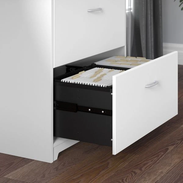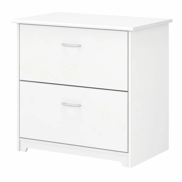 Bush Furniture Cabot 2 Drawer Lateral File Cabinet in White – The Bush Furniture Cabot 2 Drawer Lateral File Cabinet is a great way to keep important documents organized and accessible in your home office. Featuring a timeless traditional style, this filing cabinet includes two spacious drawers that accept legal, letter and A4-size paperwork. Both drawers open on smooth full-extension ball bearing slides for an effortless reach to contents, even those all the way at the back. The 2 Drawer File Cabinet can also be used alongside the coordinating Cabot Corner Desk with Storage or L Shaped Computer Desk (both sold separately) to create an extended work surface. Each drawer is fitted with stylish handles that complement your choice of several traditional or contemporary finish options to complete the simple, elegant appearance. This 2 drawer lateral filing cabinet is tested to meet ANSI/SOHO quality standards for safety and performance and is backed by the Bush Furniture 1 Year Manufacturer’s Warranty. See the full collection for coordinating items available.