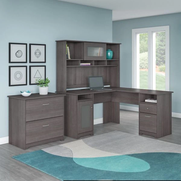Bush Furniture Cabot 60W L Shaped Computer Desk with Hutch and Lateral File Cabinet in Heather Gray – Work in style with the Bush Furniture Cabot L Shaped Computer Desk with Hutch and Lateral File Cabinet. Enjoy a beautiful traditional look with smart features for your convenience. The L Shaped Desk design provides a large durable work surface and just the right amount of storage to keep you feeling neat and organized. Desk storage details include an enclosed cabinet with a stylish fluted glass door, a box drawer for supplies and a full-extension file drawer. Integrated technology features like a built-in 4-port USB hub keep all your devices connected while you work. The Hutch boasts a matching fluted glass door, two large open compartments and four work-in-progress areas to help keep your Desk surface clutter free, along with a cable management system to control your cords. Featuring two spacious drawers, the Lateral File Cabinet is crafted to hold both letter and legal-size files with ease. Each drawer opens on smooth full-extension ball bearing slides for an effortless reach to contents. The filing cabinet matches the Desk’s height to extend your work area when placed side by side. Choose from a variety of traditional and contemporary finish options to find the perfect look for your space. This home office desk with storage set meets ANSI/SOHO test standards for safety and performance and is backed by the Bush Furniture 1 Year Manufacturer’s Warranty.