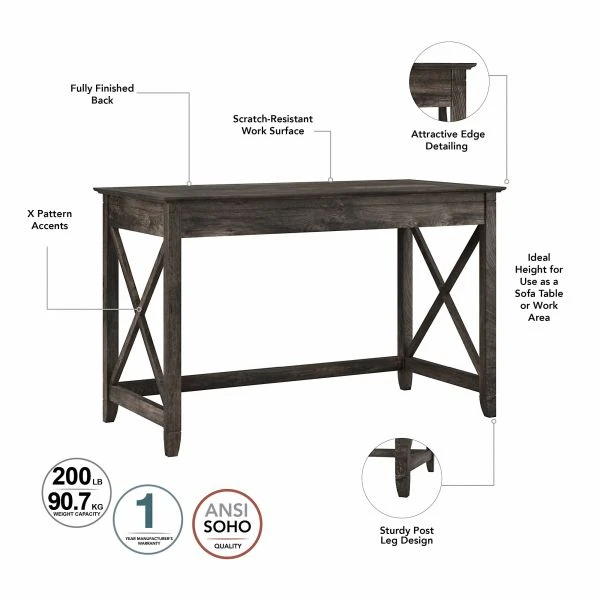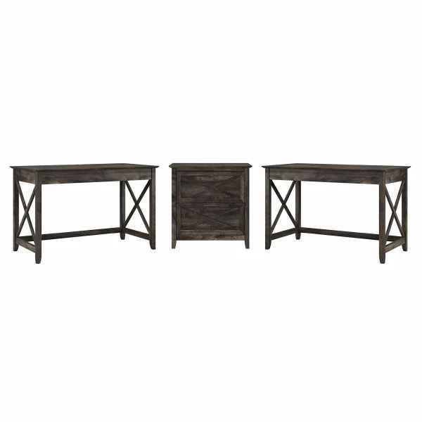Bush Furniture Key West 2 Person Desk Set with Lateral File Cabinet in Dark Gray Hickory – The Bush Furniture Key West 2 Person Desk Set with Lateral File Cabinet offers a flexible home office solution with easy going style. Matching 48W x 24D Writing Desk surfaces provide plenty of room to spread out with a computer and paperwork as you check the mail, pay bills or surf the web. A sturdy and attractive post leg design supports each desktop for a weight capacity of 200 pounds so you can tackle your next project or assignment with all your materials within arm’s reach. Position the small desks side by side or front to front for a combined workspace that allows users to share resources, or use one in your home office and the other as a sofa table or console table. The lateral filing cabinet features two drawers that open on smooth full-extension ball bearing slides for an effortless reach to letter, legal and A4-size documents. The 2 Drawer File Cabinet also matches the Desk’s height to provide even more configuration options. The home office furniture set’s unique X pattern accents and your choice of several casual finishes make it a great fit for homes that embrace cottage, coastal and farmhouse decor. This Desk with File Cabinet Set is tested to meet ANSI/SOHO quality standards for safety and performance and is backed by the Bush Furniture 1 Year Manufacturer’s Warranty. See the full collection for coordinating items to expand your living space with Key West’s relaxed style.