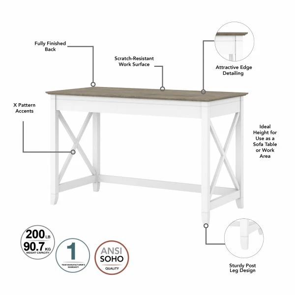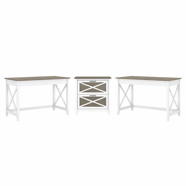 Bush Furniture Key West 2 Person Desk Set with Lateral File Cabinet in Pure White and Shiplap Gray – The Bush Furniture Key West 2 Person Desk Set with Lateral File Cabinet offers a flexible home office solution with easy going style. Matching 48W x 24D Writing Desk surfaces provide plenty of room to spread out with a computer and paperwork as you check the mail, pay bills or surf the web. A sturdy and attractive post leg design supports each desktop for a weight capacity of 200 pounds so you can tackle your next project or assignment with all your materials within arm’s reach. Position the small desks side by side or front to front for a combined workspace that allows users to share resources, or use one in your home office and the other as a sofa table or console table. The lateral filing cabinet features two drawers that open on smooth full-extension ball bearing slides for an effortless reach to letter, legal and A4-size documents. The 2 Drawer File Cabinet also matches the Desk’s height to provide even more configuration options. The home office furniture set’s unique X pattern accents and your choice of several casual finishes make it a great fit for homes that embrace cottage, coastal and farmhouse decor. This Desk with File Cabinet Set is tested to meet ANSI/SOHO quality standards for safety and performance and is backed by the Bush Furniture 1 Year Manufacturer’s Warranty. See the full collection for coordinating items to expand your living space with Key West’s relaxed style.