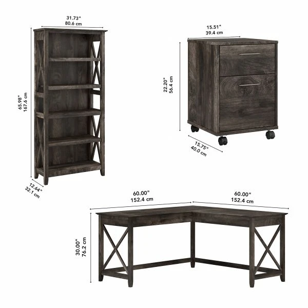 Bush Furniture Key West 60W L Shaped Desk with 2 Drawer Mobile File Cabinet and 5 Shelf Bookcase in Dark Gray Hickory – Create a personal workspace with easy going style and plenty of storage for all the materials you need to stay productive. The Bush Furniture Key West 60W L Shaped Desk with Mobile File Cabinet and Tall 5 Shelf Bookcase offers an ideal set up for home and small offices. Save space in compact areas by placing the Desk in a corner or make use of the fully finished back to take a prominent position in the middle of the room. At 60W x 60D and capable of supporting up to 200 pounds, the work surface is spacious and durable enough to spread out with a computer, books, paperwork and more when taking on your task of the day. The 2 drawer filing cabinet fits under the L Desk and has front locking casters for secure placement. The file drawer opens on full-extension ball bearing slides for an easy reach to letter size documents while a box drawer keeps office supplies and utensils close by. The Bookcase features three adjustable shelves for flexible storage and two fixed shelves for stability. Wall attachment hardware is included to fix the bookshelf in place for family-friendly safety. Sturdy post leg designs with unique X pattern accents create a relaxed appearance while your choice of several casual finishes blend seamlessly with coastal and farmhouse decor. This L shaped computer desk with storage set is tested to meet ANSI/SOHO quality standards for safety and performance and is backed by the Bush Furniture 1 Year Manufacturer’s Warranty.
