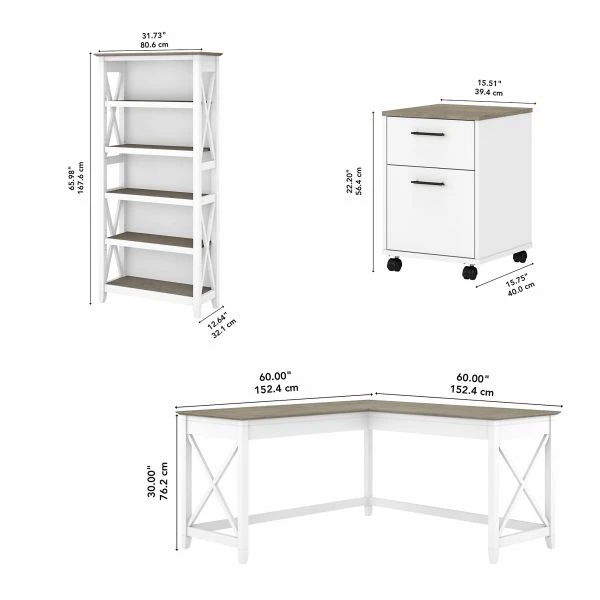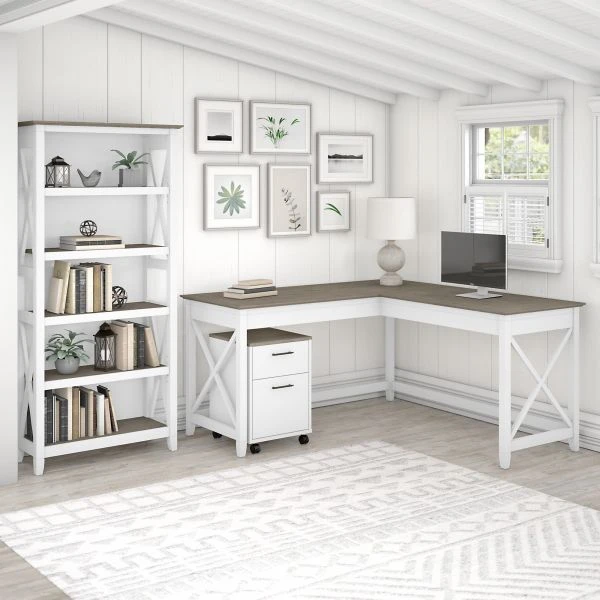 Bush Furniture Key West 60W L Shaped Desk with 2 Drawer Mobile File Cabinet and 5 Shelf Bookcase in Pure White and Shiplap Gray – Create a personal workspace with easy going style and plenty of storage for all the materials you need to stay productive. The Bush Furniture Key West 60W L Shaped Desk with Mobile File Cabinet and Tall 5 Shelf Bookcase offers an ideal set up for home and small offices. Save space in compact areas by placing the Desk in a corner or make use of the fully finished back to take a prominent position in the middle of the room. At 60W x 60D and capable of supporting up to 200 pounds, the work surface is spacious and durable enough to spread out with a computer, books, paperwork and more when taking on your task of the day. The 2 drawer filing cabinet fits under the L Desk and has front locking casters for secure placement. The file drawer opens on full-extension ball bearing slides for an easy reach to letter size documents while a box drawer keeps office supplies and utensils close by. The Bookcase features three adjustable shelves for flexible storage and two fixed shelves for stability. Wall attachment hardware is included to fix the bookshelf in place for family-friendly safety. Sturdy post leg designs with unique X pattern accents create a relaxed appearance while your choice of several casual finishes blend seamlessly with coastal and farmhouse decor. This L shaped computer desk with storage set is tested to meet ANSI/SOHO quality standards for safety and performance and is backed by the Bush Furniture 1 Year Manufacturer’s Warranty.