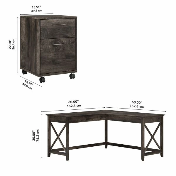 Bush Furniture Key West 60W L Shaped Desk with 2 Drawer Mobile File Cabinet in Dark Gray Hickory – The Bush Furniture Key West 60W L Shaped Desk with Mobile File Cabinet turns any room into a practical home office with easy going style. Save floor space in compact areas by rolling the Cabinet under the Desk and placing the set in a corner, or make use of the fully finished backs to take a prominent position in the middle of the room. At 60W x 60D, the durable work surface is spacious enough to spread out with a computer, paperwork and more when taking on your task of the day. A sturdy post leg design with unique X pattern accents on the side panels creates a relaxed, open appearance while quality construction and materials allow the corner desk to support up to 200 pounds. The 2 drawer filing cabinet rolls on dual-wheeled casters and locks into place for secure positioning. The file drawer opens on full-extension ball bearing slides and accommodates letter size documents while a box drawer provides storage for office supplies and utensils. Available in your choice of several casual finishes, this L shaped computer desk with storage coordinates with a wide range of products including Desktop Organizers, a Lateral File Cabinet and a 5 Shelf Bookcase (all sold separately) to complete your personal workspace with laid back charm of farmhouse decor. This home office furniture set is tested to meet ANSI/SOHO quality standards for safety and performance and is backed by the Bush Furniture 1 Year Manufacturer’s Warranty.