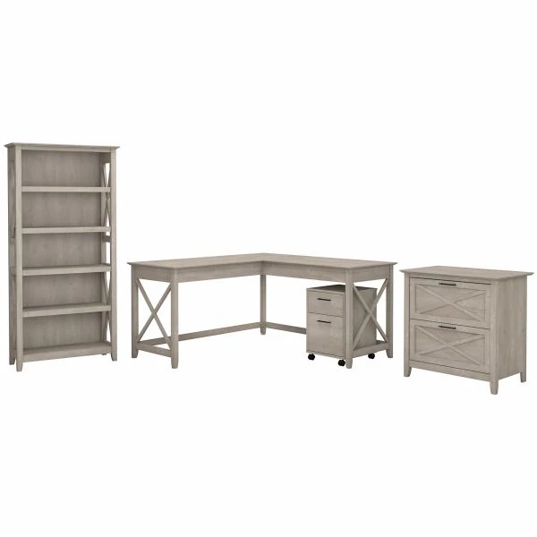 Bush Furniture Key West 60W L Shaped Desk with File Cabinets and 5 Shelf Bookcase in Washed Gray – A comprehensive personal workspace with easy going style, the Bush Furniture Key West 60W L Shaped Desk with File Cabinets and Tall 5 Shelf Bookcase offers an ideal set up for home and small offices. At 60W x 60D, the durable work surface is spacious enough to spread out with a computer, paperwork and more when taking on your task of the day or just browsing the web. Keep important materials close by with a Mobile File Cabinet that rolls on dual-wheeled casters and fits conveniently under the Desk. The file drawer opens on smooth ball bearing slides for an easy reach to letter size documents while a box drawer holds smaller office supplies and writing utensils. Store legal and letter size files in the 2 Drawer Lateral File Cabinet, which also has full-extension ball bearing slides and matches the height of the 30H corner desk to offer an extended work surface when placed side-by-side. The Bookcase features three adjustable shelves for flexible storage and display along with two fixed shelves for stability. Wall attachment hardware is included to fix the bookshelf in place for family-friendly safety. Sturdy post leg designs and unique X pattern accents create a relaxed, open appearance while your choice of several casual finishes blend seamlessly with coastal and farmhouse decor. This L shaped computer desk with storage set is tested to meet ANSI/SOHO quality standards for safety and performance and is backed by the Bush Furniture 1 Year Manufacturer’s Warranty.