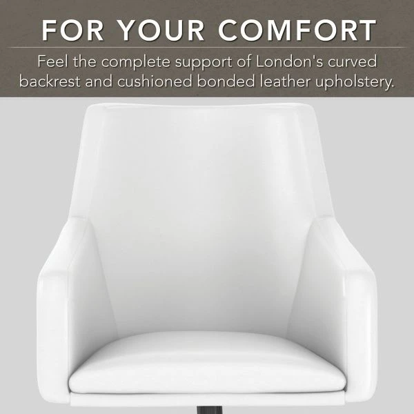 - White chair features smooth bonded leather upholstery with medium-firm foam cushioning