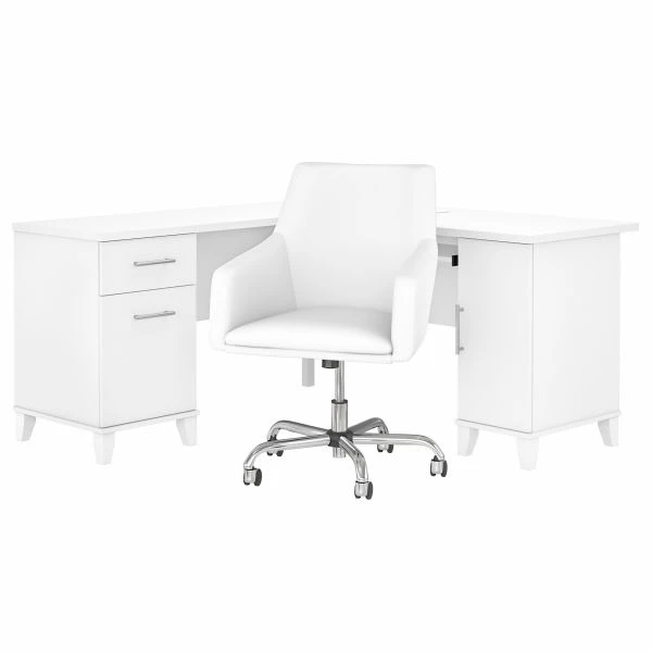 Bush Furniture Somerset 60W L Shaped Desk with Mid Back Leather Box Chair in White – The Bush Furniture Somerset 60W L Shaped Desk with Mid Back Leather Box Chair offers an all-in-one workspace that makes the most of your home office. Save space in compact areas by placing the Desk in a corner or make use of the finished back to take a prominent position in the middle of the room. The desktop provides a 60 inch work surface in each direction and includes built-in wire management to keep cords out of the way. A keyboard tray pulls out from underneath the Desk and can also be used to hold a tablet or laptop. A vertical cabinet with one adjustable shelf offers flexible storage for books and other reference materials. The file drawer opens on smooth full-extension ball bearing slides for an easy reach to letter-size documents, and the box drawer is perfect for keeping office supplies and writing utensils easily accessible. Storage options can be mounted on either side of the L Desk for a custom configuration. Featuring a mid-century modern design with bonded leather upholstery and a chrome base, the Box Chair provides an ideal complement to Somerset’s transitional styling. Foam cushioning gives the seat a medium-firm feel while the curved backrest wraps around the body and tapers at the sides to support the elbows and forearms. The chair’s height and tilt tension can be adjusted to meet your own personal preferences. This home office furniture set is tested to meet ANSI/SOHO standards for safety and performance and is backed by a 6 Year Manufacturer’s Warranty.