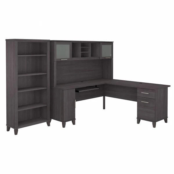 Bush Furniture Somerset 72W L Shaped Desk with Hutch and 5 Shelf Bookcase in Storm Gray – With practical features and a stylish design, the Bush Furniture Somerset 72W L Shaped Desk with Hutch and 5 Shelf Bookcase delivers a personal workspace perfect for the home or small office. The expansive 72W surface with wire management offers ample room to spread out and complete large projects. A convenient pull-out shelf provides a perfect place to keep a keyboard or laptop, while a vertical cabinet with an adjustable shelf and a box drawer offer plenty of storage for office supplies and utensils. A file drawer opens on smooth ball bearing slides for an easy reach to letter size documents, even those all the way in the back. The Hutch mounts to either side of the L Shaped Desk and has large open compartments for books, binders or decorations and two frosted glass doors for concealed storage. The 5 Shelf Bookcase matches the height of the Desk and Hutch set to create a coordinated look in your office. Two of the Bookcase’s shelves are fixed for stability and three are adjustable to ensure that items of all sizes have their place. Transitional styling includes your choice of several attractive finishes with tapered leg accents and contemporary metal hardware for an alluring appearance. This home office furniture set is tested to meet ANSI/SOHO quality standards for safety and performance and is backed by the Bush Furniture 6 Year Manufacturer’s Warranty. American made with U.S. and imported parts.