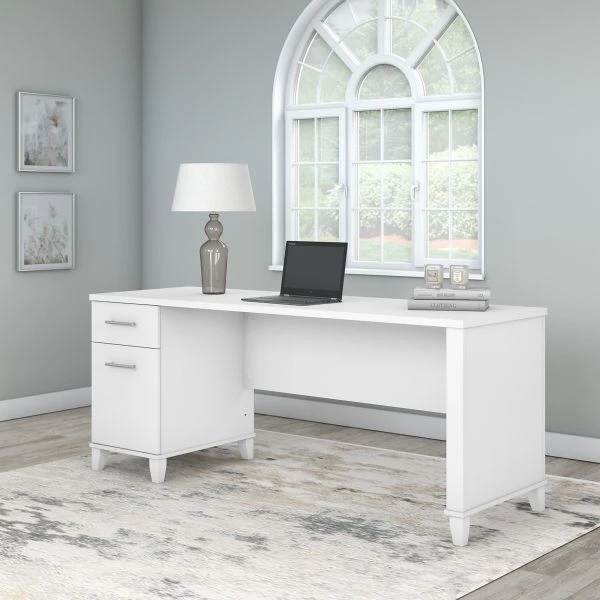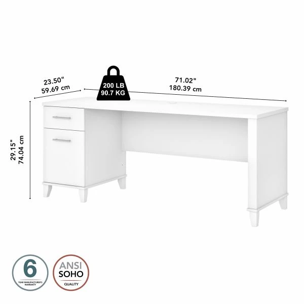 Bush Furniture Somerset 72W Office Desk with Drawers in White – An expansive work surface and built-in storage make the Bush Furniture Somerset 72W Office Desk with Drawers a perfect choice for your home office. The spacious desktop offers plenty of room to spread out with a computer and paperwork and includes a convenient wire management grommet to keep cords and cables secure and out of sight. The Desk’s file drawer opens on smooth full-extension ball bearing slides for easy access to legal and letter size documents while a box drawer keeps the office supplies and utensils you need close by. Drawers can be mounted to either side for a custom configuration, and a fully finished back side allows the Desk to look great no matter where it’s positioned in the room. Somerset’s transitional styling includes your choice of several attractive finish options with tapered leg accents and contemporary metal hardware for an appealing look that works with virtually any decor. The computer desk can also be used with the coordinating Somerset 42W 3 Position Sit to Stand Return (sold separately) to create an ergonomic height adjustable workspace. The 72W Office Desk with Drawers is tested to meet ANSI/SOHO quality standards for safety and performance and is backed by the Bush Furniture 6 Year Manufacturer’s Warranty. See the full collection for products to expand your home or small office with sophisticated style.