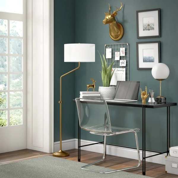 Callum Height-Adjustable Floor Lamp with Fabric Shade in Brushed Brass/White – Bring a touch of modern elegance to your living room or bedroom with this eye-catching minimalist floor lamp. The gentle curve of the lamp leads to a crisp drum shade that adds sophistication and warm lines to the design of your home. Let this lamp’s appealing blend of curves and angles illuminate your space in style.