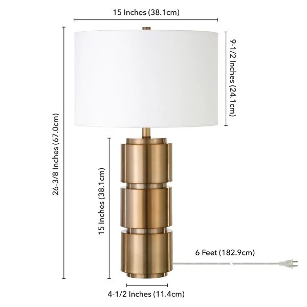 Campbell 27″ Tall Table Lamp with Fabric Shade in Brass/White – Add a touch of mid-century flair to any room with this handsome table lamp. The thick cylindrical body is finished in golden brass, bringing a warm, modern feel when paired with the clean lines of its drum shade. This 27″ lamp is made to stand out or blend in, with its neutral tones designed to complement many decor styles and color schemes.