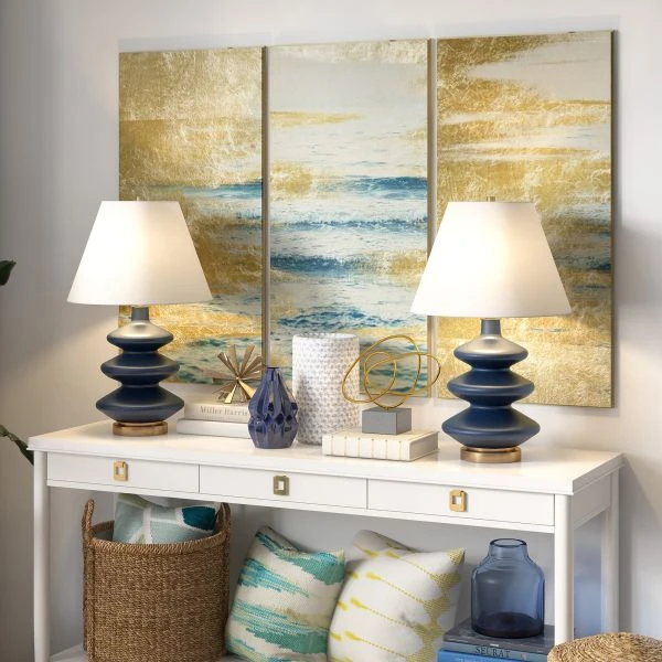 Carleta 26.5″ Tall Triple Gourd Table Lamp with Fabric Shade in Blue/White – This contemporary table lamp features a triple gourd base made of glass. The body is finished with a matte exterior and is topped off with a white linen empire shade that complements the soft curves featured in the design.