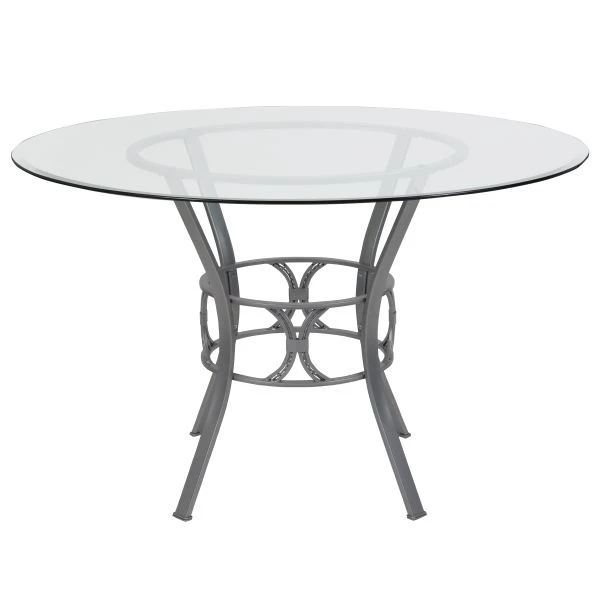 Carlisle 48” Round Glass Dining Table with Silver Metal Frame – Building the perfect dining room is easier when you have a great foundation. Starting with an exquisite ornamental pedestal base this 48″ glass topped dining table is off to a phenomenal start. Crowned by a round, thick glass top with beveled edges that shimmer in the light, this striking table will add an elegant aspect to your dining room or kitchen. On the practical side, floors are protected with floor glides in case of accidental movement or rearrangement. Gather family and friends to enjoy great meals around this dazzling table.
