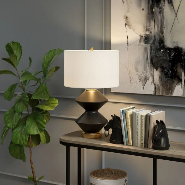 Caserta 22.75″ Tall Double Gourd Lamp with Fabric Shade in Matte Black/Brass/White – Add a touch of understated modern style to your living room, bedside, or den with this contemporary table lamp. It features a double gourd glass base finished with a matte exterior in a neutral tone to suit any color scheme. The fixture is topped off with a crisp white linen drum shade that perfectly complements the soft curves featured in the design.
