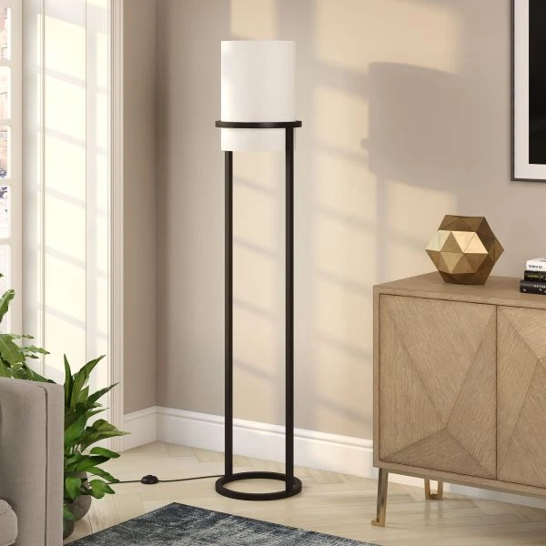 Casimir 62″ Tall Floor Lamp with Fabric Shade in Blackened Bronze/White – This Industrial glam floor lamp shines in any space. Simple yet chic, this fixture lights small to large spaces with ease. The fabric shade mimics the base in design and shape.