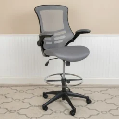 Kelista Mid-Back Dark Gray Mesh Ergonomic Drafting Chair With Adjustable Foot Ring And Flip-Up Arms