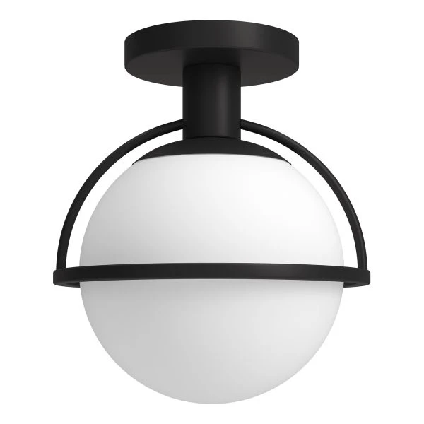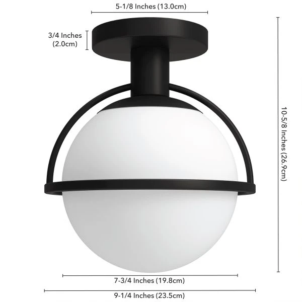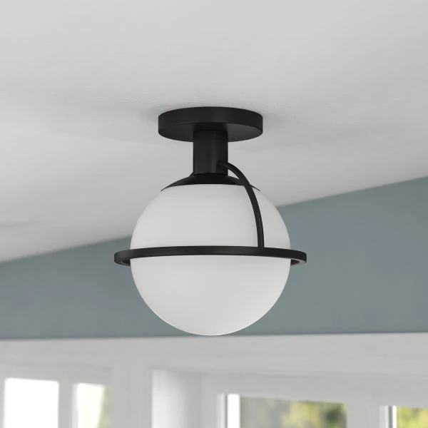 Cieonna 9.25″ Wide Semi Flush Mount with Glass Shade in Blackened Bronze/White – Pairing a modern canopy with a retro-inspired drop-globe shade, this semi flush mount ceiling light creates a classic mid-century look in your entranceway, hallway, or dining room. The enclosed white milk glass shade diffuses light gently throughout your space without a glare. The warm neutral metallic base artfully frames the fixture, creating a clean on-trend look.