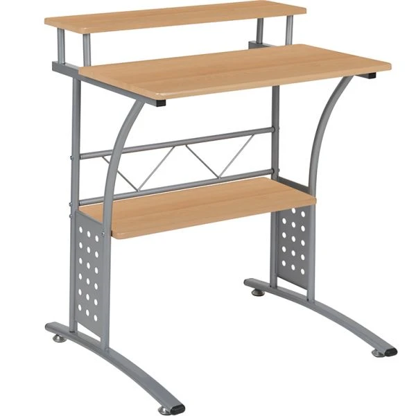 Clifton Maple Computer Desk with Top and Lower Storage Shelves – Streamline your home office with this on-trend mixed media computer desk that definitely makes a statement. Offering an efficient workstation that fits well in small spaces, this office desk with storage shelves is ideal for apartment living or dorm rooms. The contrasting silver perforated design frame pairs beautifully with the wood grain laminate shelving for a modern look. The generous desk surface boasts a smooth maple finish with a raised top shelf for your monitor or keepsakes and a lower bottom shelf for your hard-drive and other supplies. The two shelf desk has a powder coated steel frame for long-lasting durability. Self-leveling floor glides keep your desk from wobbling on uneven floor surfaces and protect your floors by sliding smoothly when you need to move the desk. The compact open storage shelf desk has a modern design that works well for both studying and daily tasks. Pair this home office computer desk with one of our executive swivel office chairs to complet your set-up.