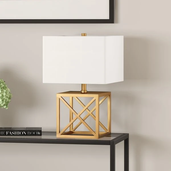 Dawson 19.5″ Tall Table Lamp with Fabric Shade in Brass/White – Complete your modern farmhouse living room or bedroom with this modern, yet whimsical table lamp. Its square base features a crisscross design finished in golden brass, bringing visual interest to the piece without weighing it down.
