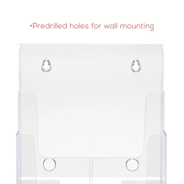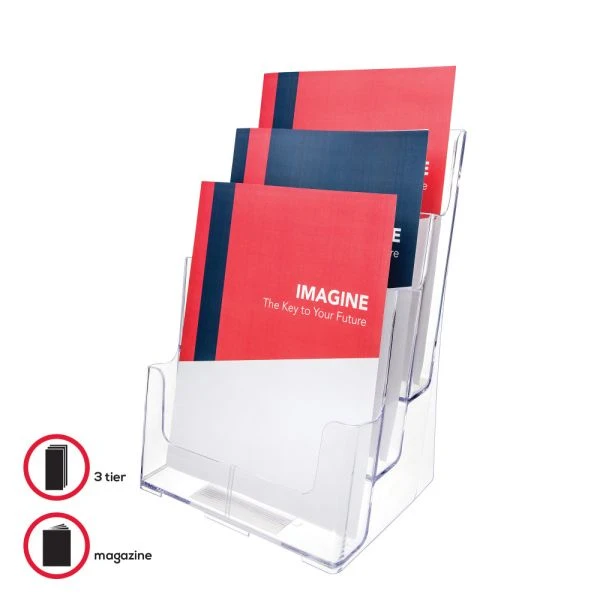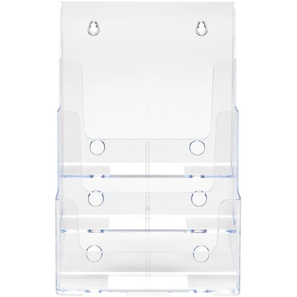 deflecto 3-Compartment DocuHolder, Magazine Size, 9.5w x 6.25d x 12.63, Clear – Compact, desktop literature holder features a three-tier design so you can display a variety of brochures. Each pocket displays literature up to 8-1/2 wide. Literature holder is made of crystal-clear plastic. Use as a stand-alone display on countertop or mount on a wall.”