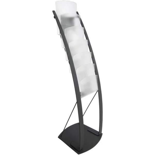 Deflecto Contemporary Floor Display – Contemporary floor stand features sleek curves and open design to create an inviting literature display. Six large-capacity compartments accommodate magazine-size materials. Each pocket holds a stack of literature up to 1-1/2 thick. Ideal for reception areas, waiting rooms and trade shows. Frame is made of metal frame. Pockets are made of frosted plastic.”