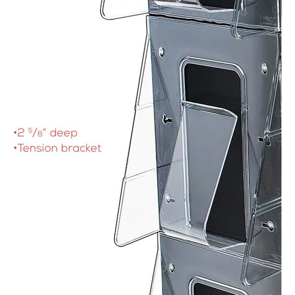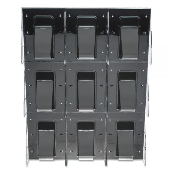 deflecto Stand-Tall 9-Bin Wall-Mount Literature Rack, Mag, 27.5w x 3.38d x 35.63h, Clear/Black – Wall-mountable literature rack offers nine magazine-size pockets arranged in three rows for easy access for your visitors. Exclusive, Stand-Tall, break-resistant pockets are attached to a black plastic panel. High-tension, spring-action bracket keeps literature upright. With a 2-5/8 capacity, each clear pocket holds a large stack of literature. Pre-assembled literature rack includes mounting hardware.”