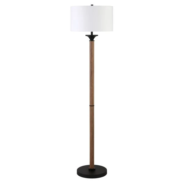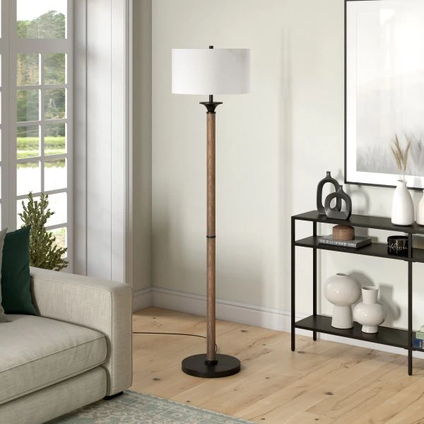 Delaney 66″ Tall Floor Lamp with Fabric Shade in Rustic Oak/Blackened Bronze – Add visual interest to any room with this two-toned modern rustic floor lamp. The sturdy steel base is finished in rustic oak wrap and accented with blackened bronze detailing. A crisp linen drum shade keeps the look polished, while the mixed material provide an eclectic vibe that will be easy to pair with many color schemes and design inspirations.