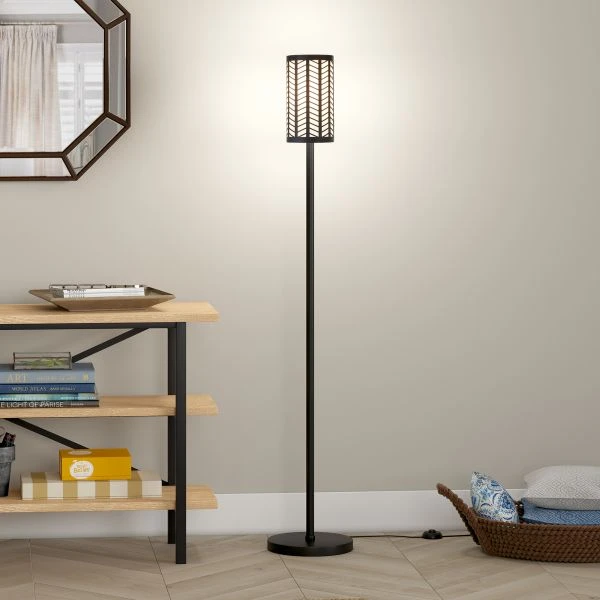 Delia 63.5″ Tall Floor Lamp with Metal Shade in Blackened Bronze/Blackened Bronze – Add a touch of whimsy to your lighting design with this playfully detailed floor lamp. The simple candlestick design is punctuated by a double-layered cylindrical shade, featuring a perforated chevron design in blackened bronze that creates a cozy contrast against the inner white diffuser. Allow this lamp to be the perfect complement to your eclectic style.