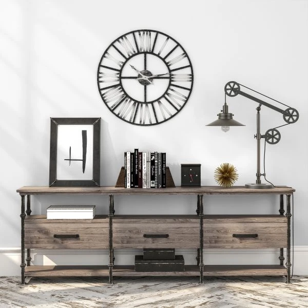 - Handcrafted aged steel finish is applied to the round adjustable metal base.