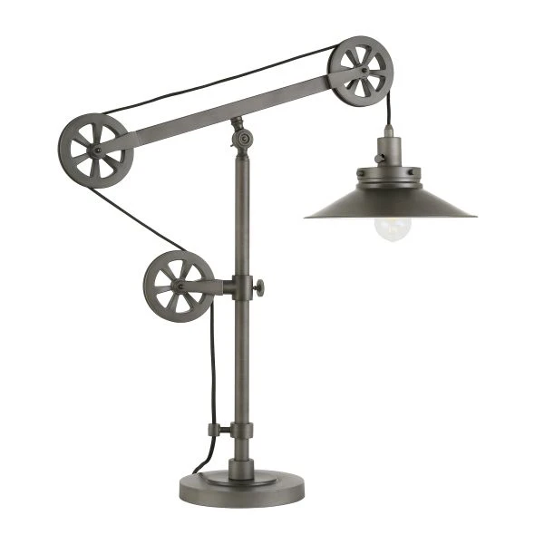 Descartes 29″ Tall Wide Brim/Pulley System Table Lamp with Metal Shade in Aged Steel/Aged Steel – This aged steel table lamp counterbalances function and design. It features an adjustable pulley system allowing you to personalize your space.