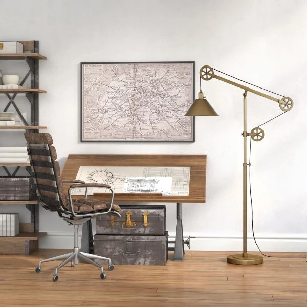 Descartes Pulley System Floor Lamp with Metal Shade in Antique Brass/Antique Brass – Forged in metal, this floor lamp counterbalances function and design. It features an adjustable pulley system allowing you to personalize your space.