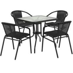 Lila 28” Square Glass Metal Table With Gray Rattan Edging And 2 Gray Rattan Stack Chairs