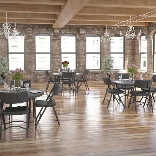 Dorel Zown Commercial Round Blow Mold Fold Table – ZOWN Classic Commercial Round Blow Mold Folding Table is the perfect table for events ranging from weddings, conferences and dinner gatherings. Its durable construction is molded from HDPE, a premium resin material capable of withstanding all weather elements for reliable indoor and outdoor use. Ergonomic design provides a pleasant, comfortable experience for those seated at the event. Capable of seating six people, this table can hold a maximum weight of 750 lb. for reliable stability when presenting food, beverages and more. Very smooth, manual locking mechanism incorporates automatic sliding rings to prevent undesired folding. Foot pads protect floors from damage. Foldable design allows the legs to fold into the frame for easy storage and transportation.