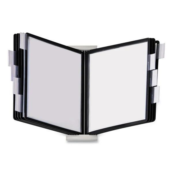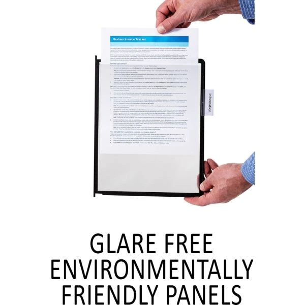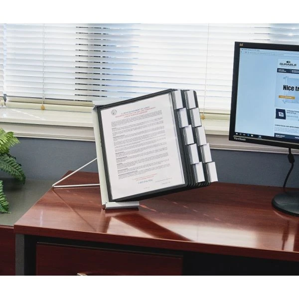 Durable InstaView Expandable Desktop Reference System, 10 Panels, Black Borders – Desk reference system offers a way to keep frequently used reference documents at your fingertips. Display important document in the included 10 letter-size, nonglare, double-sided polypropylene panels (20 viewing sides) with rigid borders and five snap-on tabs. Reference system includes a wire desk stand and two snap-on connectors. To expand, use included connectors to link systems together. Additional InstaView systems are sold separately.