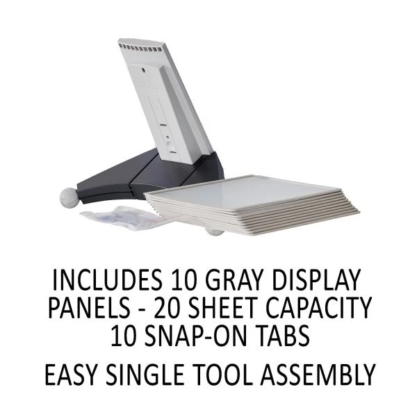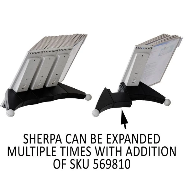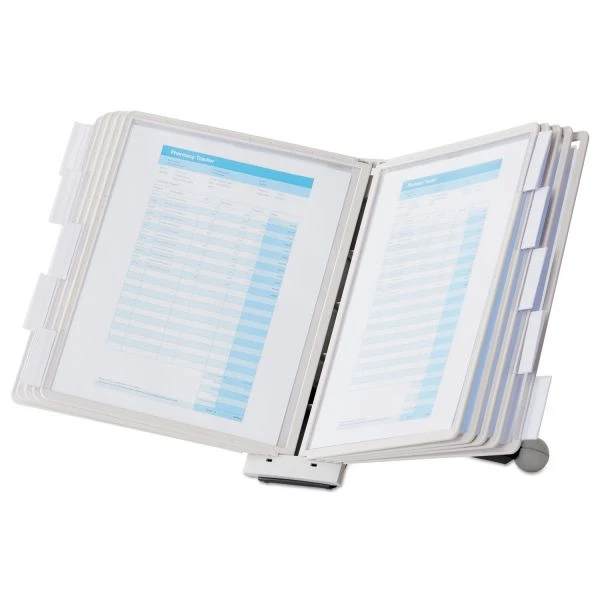 Durable SHERPA Desk Reference System, 10 Panels, 10 x 5.88 x 13.5, Gray Borders – Desk reference system contains a rugged plastic desk stand, 10 letter-size panel sleeves (20 viewing sides) with molded colored outer frames, and 10 snap-on tabs. Desk reference system can be expanded multiple times with Durable Sherpa Extension Modules (5698).