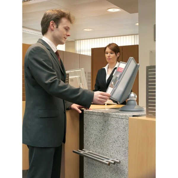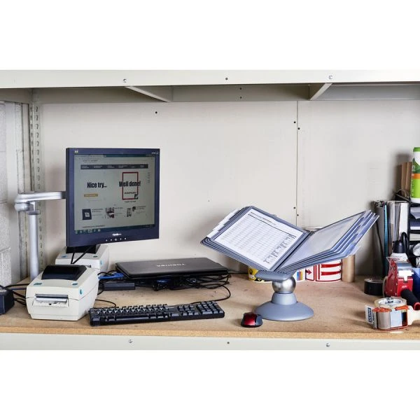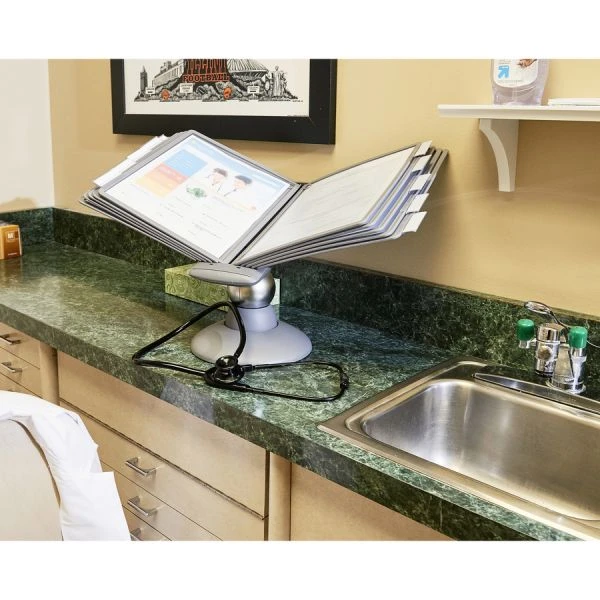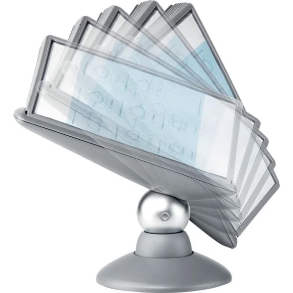 Durable SHERPA Motion Desk Reference System, 10 Panels, Gray Borders – Desk reference system is ideal for public information areas, shared workstations and high-profile settings. The Sherpa Motion fluidly rotates 360 degrees on a heavyweight base and permits reading angle to be adjusted between 25 and 70 degrees. Included 10 letter-size panels offer 20 viewing sides. Sleeves open on two sides for easy paper insertion. Paper Secure corner clips hold pages safely in place. Desk reference system is made of plastic with a graphite finish and does not expand.