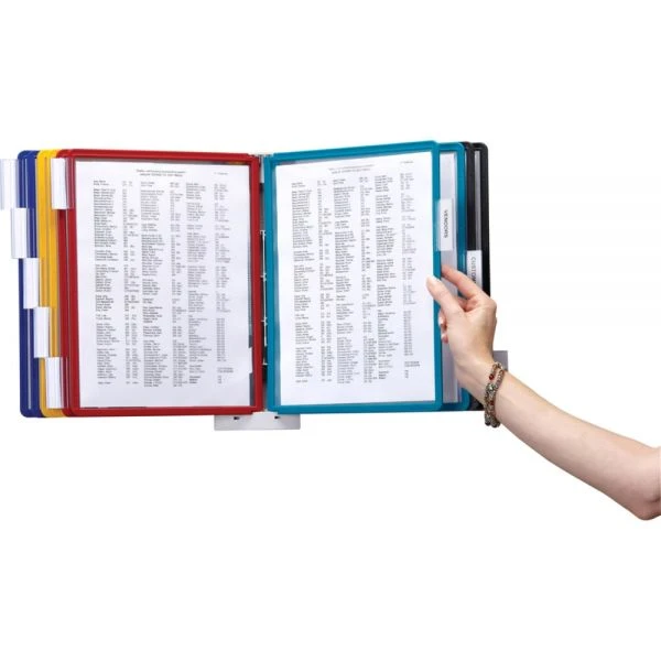 Durable Sherpa Sherpa Wall-Mount Reference System, 10 Gray Panels, Letter, Assorted Borders – Sherpa 10-panel display wall reference system blends sturdy plastic construction with contemporary design. System includes a wall bracket, 10 letter-size panel sleeves (20 viewing sides) with reinforced molded borders and 10 snap-on tabs. Expands by adding systems side by side.