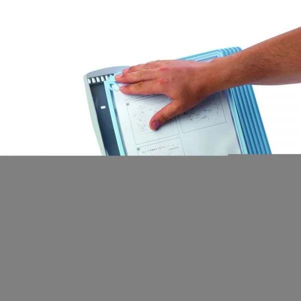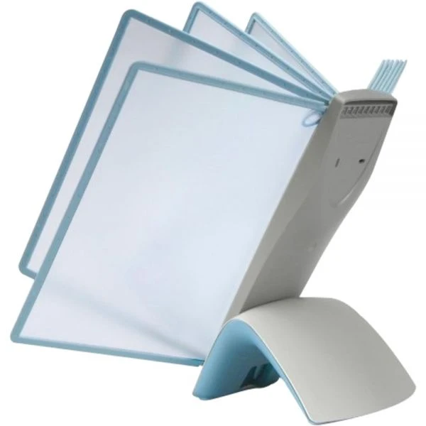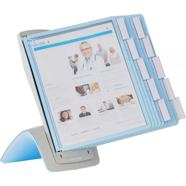 Durable SHERPA Style Desk-Mount Reference System, 10 Panel, 20 Sheet Capacity, Blue/Gray – Create a cleaner, safer environment—antimicrobial protection imhibits bacterial build-up. Pockets are open at the top and inside edge. “Paper Secure” corner clip holds pages safely in place and adds stylish design accent. Glare-free polypropylene pockets have light blue frames.