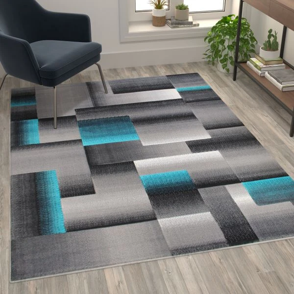Elio Collection 5′ x 7′ Turquoise Color Blocked Area Rug – Olefin Rug with Jute Backing – Entryway, Living Room, or Bedroom – If you love modern art, then the abstract color blocked pattern of this area rug is just the ticket to complete your design scheme. Offering not only striking looks, this versatile contemporary accent rug allows you to add warmth to hardwood floors, color in multiple spaces, and protects flooring in high-traffic areas. This high pile area rug can be a warm place for your feet by the bed, in front of your couch, or in the hallway. Modern materials allow today’s rugs to last for years. Made from olefin fibers, this cutting edge area rug is stain and water resistant, colorfast, and provides a soft underfoot feel friendly to kids and pets. The jute backing gives this rug structural integrity and helps promote air flow. Vacuum regularly without the beater bar and spot clean with water and a mild detergent to maintain the look of your new rug.