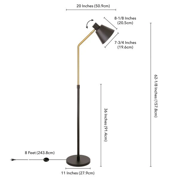 Elmer Two-Tone Floor Lamp with Metal Shade in Blackened Bronze/Brass/Blackened Bronze – Add visual interest to any room with this mid-century-inspired floor lamp. Finished in two complementary neutral tones, the gentle curve of the lamp’s base leads to cone-shaped metal shade. At 65” tall, this standing lamp is the perfect reading or task light for your living room, den, or home office.
