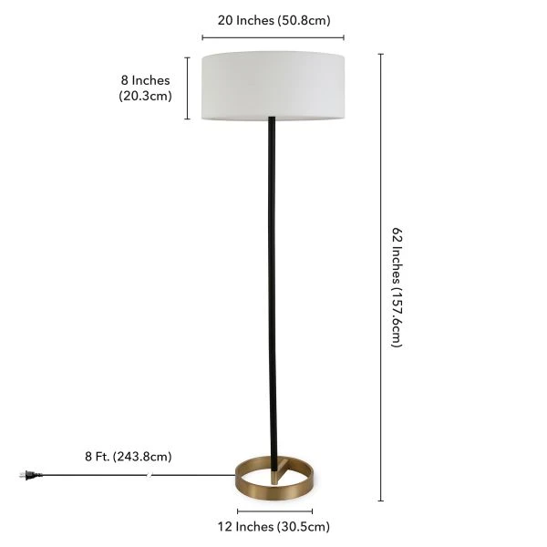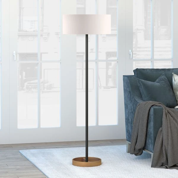 Estella Two-Tone Floor Lamp with Fabric Shade in Matte Black/Brass/White – Bring a touch of glam mid-century modern style to any room with this two-toned floor lamp. On-trend lustrous metallic finishes are perfectly paired to elevate your design scheme. A crisp oversized drum shade tops the sleek minimalist base, illuminating your space with a polished contemporary look.