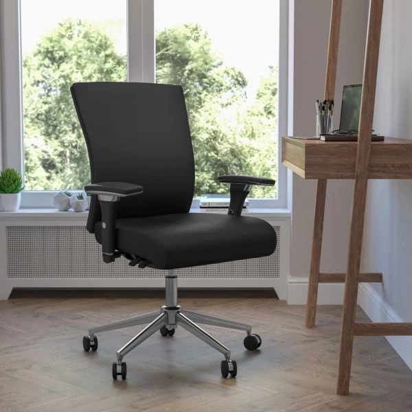 Flash Furniture HERCULES Series 24/7 Multi-Shift Leather Multi-Functional Executive Swivel Chair with Seat Slider – This chair was designed to meet your around the clock needs. Also known as multi-shift task chairs, a 24-hour office chair is designed for extended use or multiple-shift environments. This chair can be used in a 9-5 setting, but it was specifically designed to meet the needs of workers in 911 dispatch offices, nurses’ stations, call centers, control room engineers, disc jockeys, and government personnel. This chair has been tested to hold a capacity of up to 300 lbs. The chair offers support to the mid-to-upper back region. The synchro tilt control allows the chair’s back and seat to recline at different rates, increasing the angle between your torso and thighs. The seat depth adjustment changes the depth of the seat to accommodate the length of your thighs. Changing the seat depth keeps your back in contact with the backrest while avoiding pressure behind your knees. The waterfall front seat edge removes pressure from the lower legs and improves circulation. Chair easily swivels 360 degrees to get the maximum use of your workspace without strain. The pneumatic adjustment on this chair offers a very smooth adjustment range to achieve your desired height. The adjustable armrests take the pressure off the shoulders and the neck, which minimizes the risk of pain. The arm pads also pivot inward and outward for greater customization. The heavy duty chrome base is constructed to keep up with the demands of an intensive use chair. The beloved LeatherSoft upholstery will add an upscale appeal to your office.